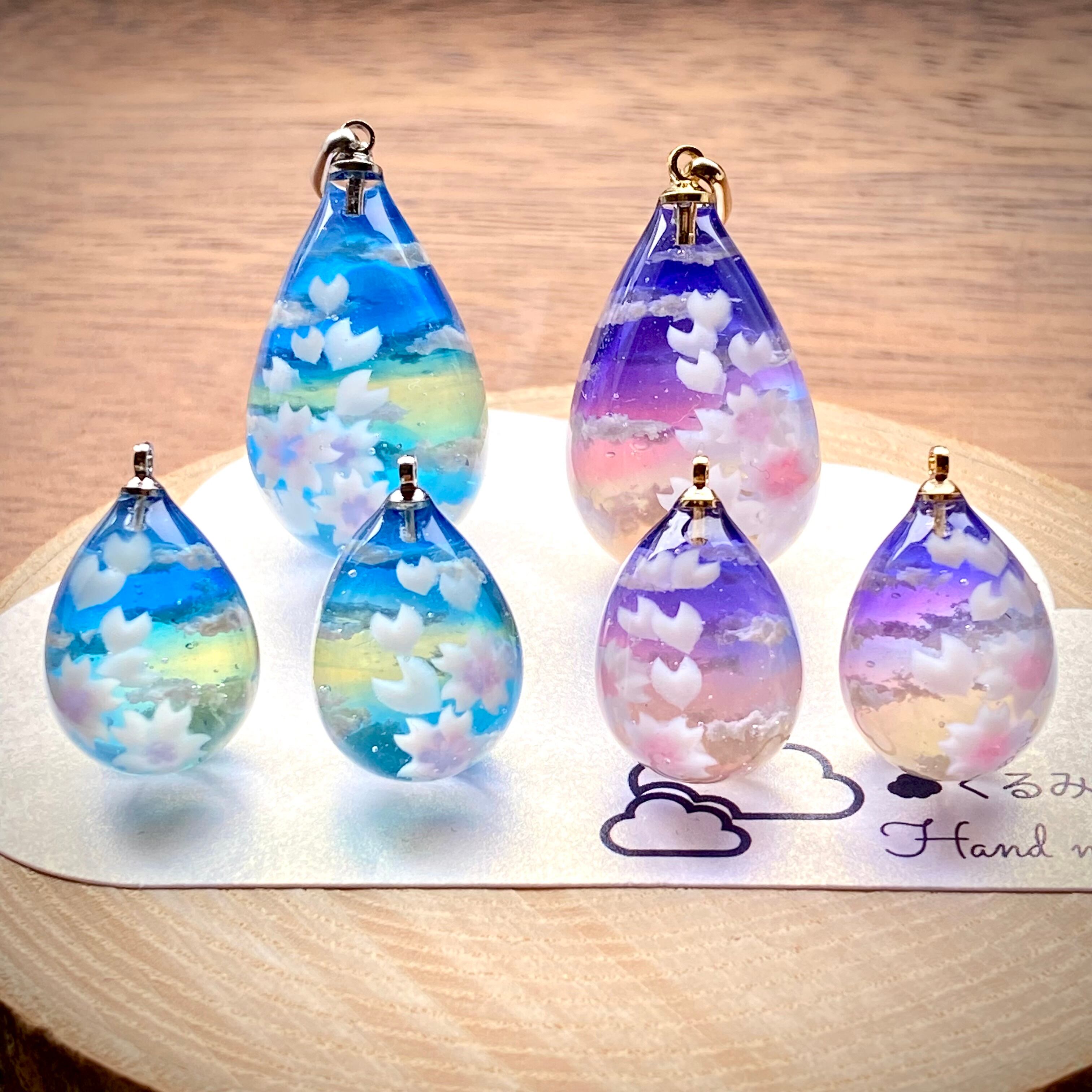 桜の花びらが舞い散る夕暮れ空をイメージしてしずく型ペンダントを作りました。