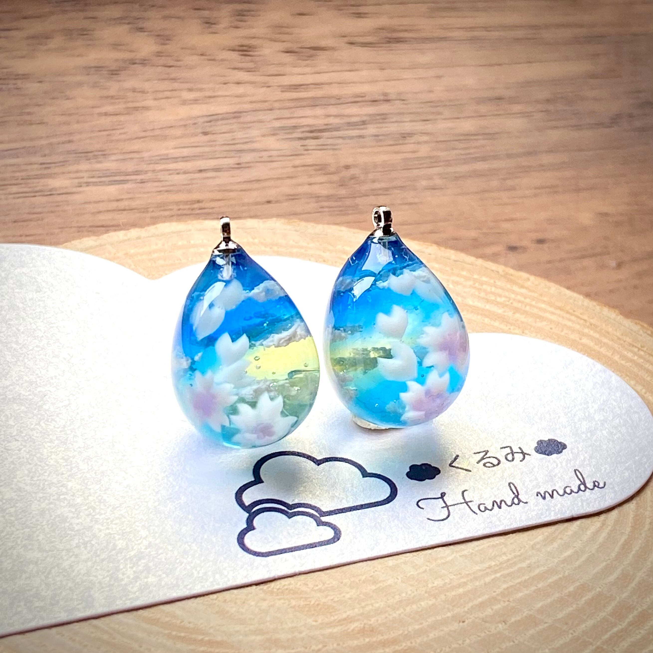 青空に舞い散る桜をイメージしてたまご型ピアスを作りました。
