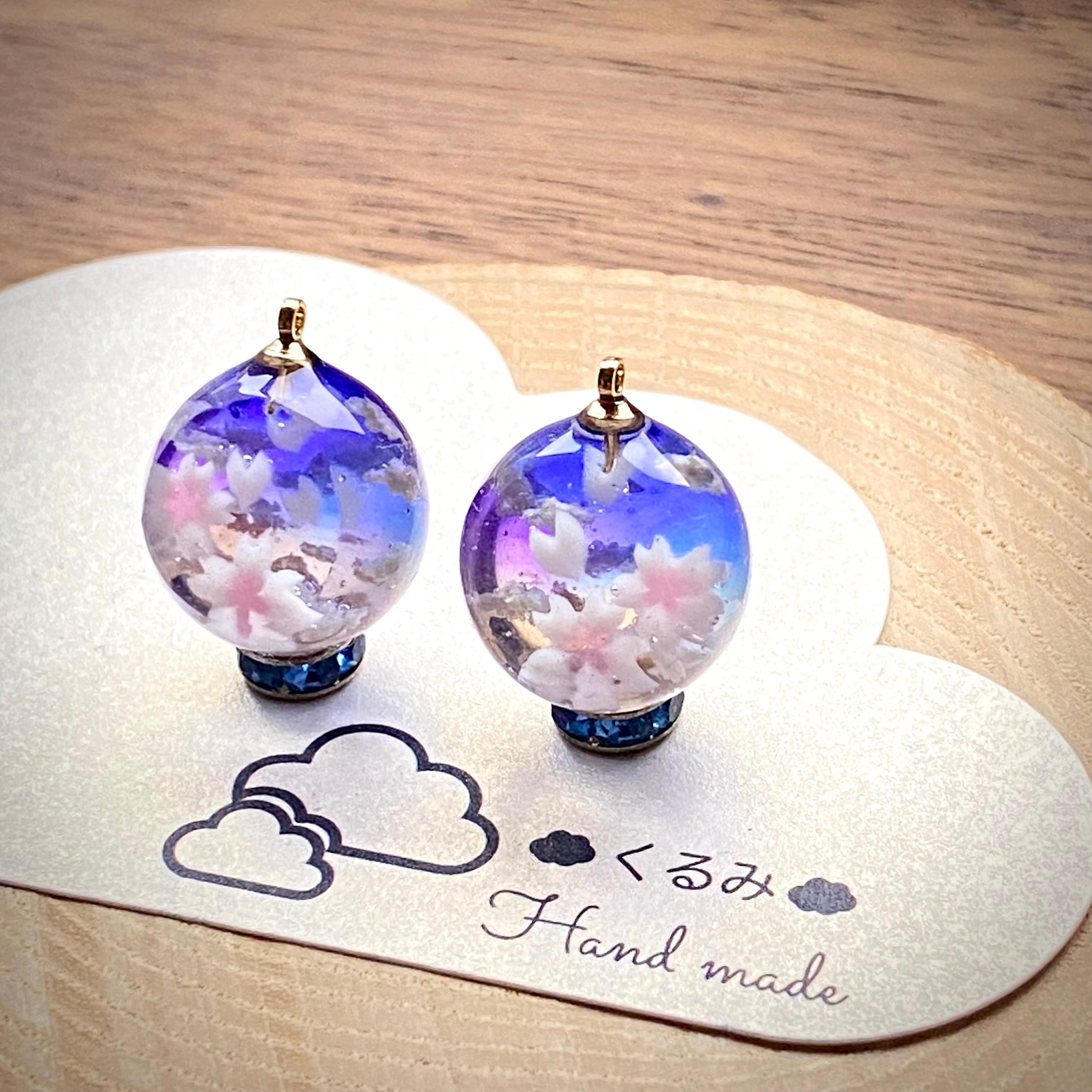 レジンピアス イヤリング 夕暮れ空に舞い散る桜 2割カット球体 15mm