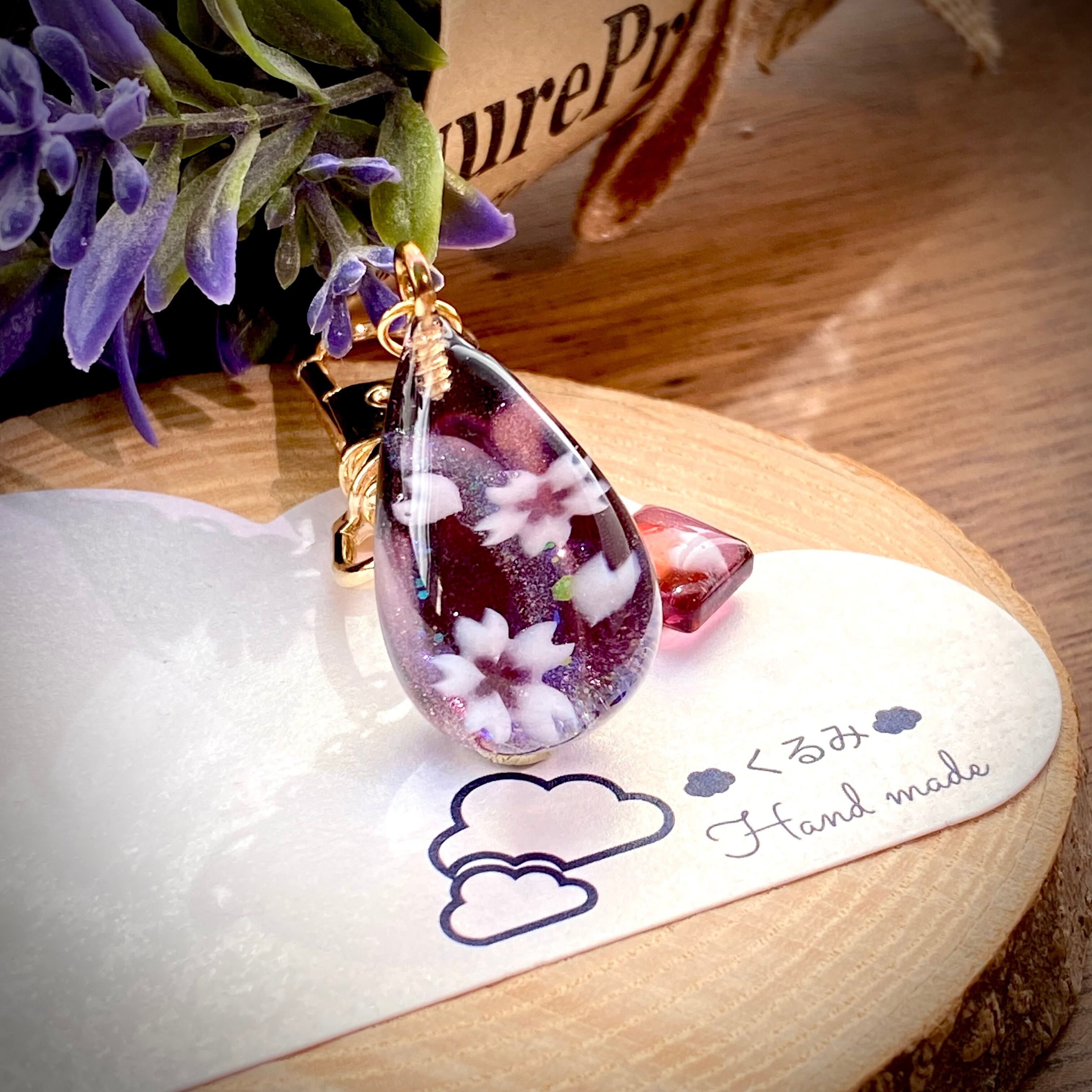 桜の花びらを閉じ込めたようなしずく型バックチャームを作りました。
