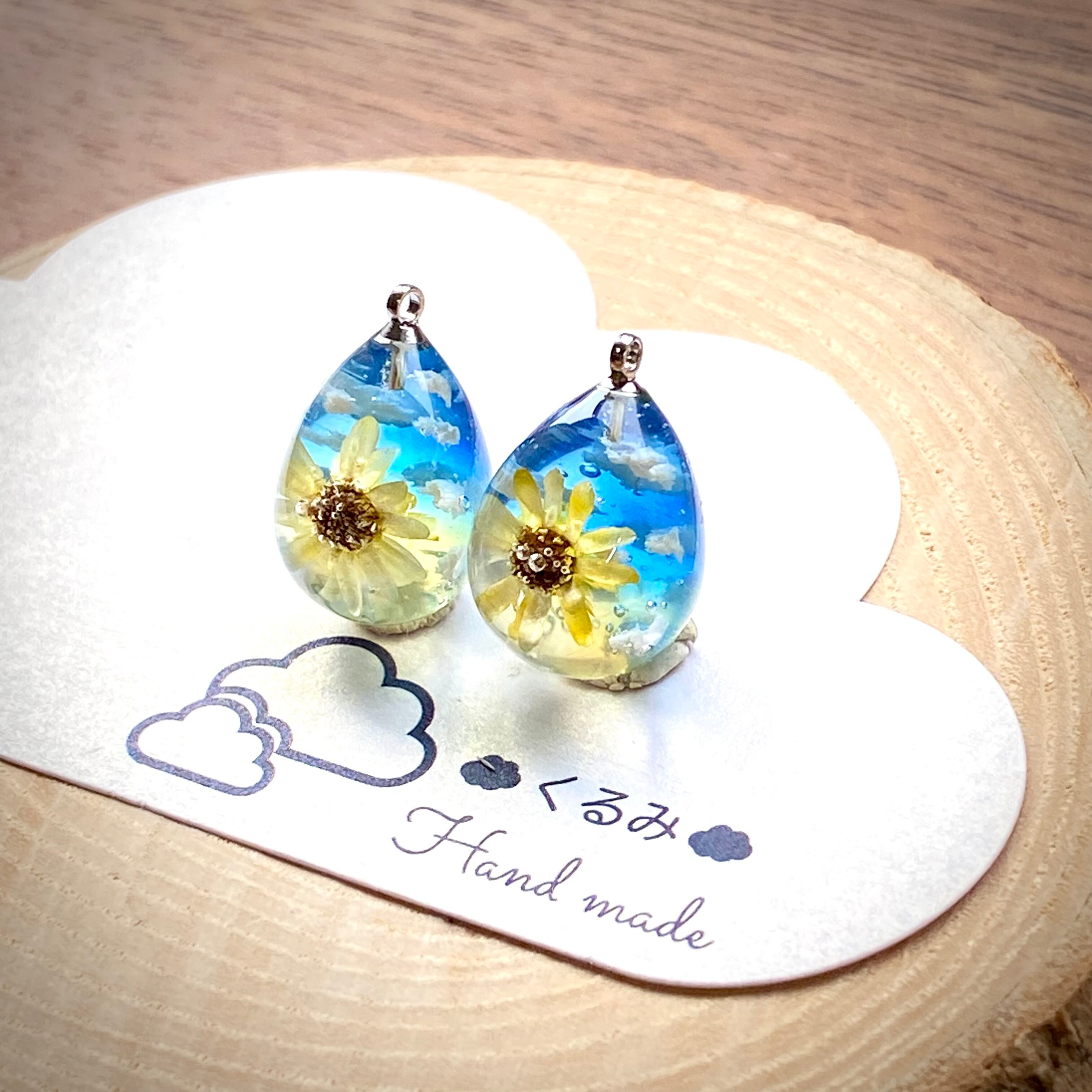 レジンピアス イヤリング ひまわりと青空 たまご型 15×12mm シルバー