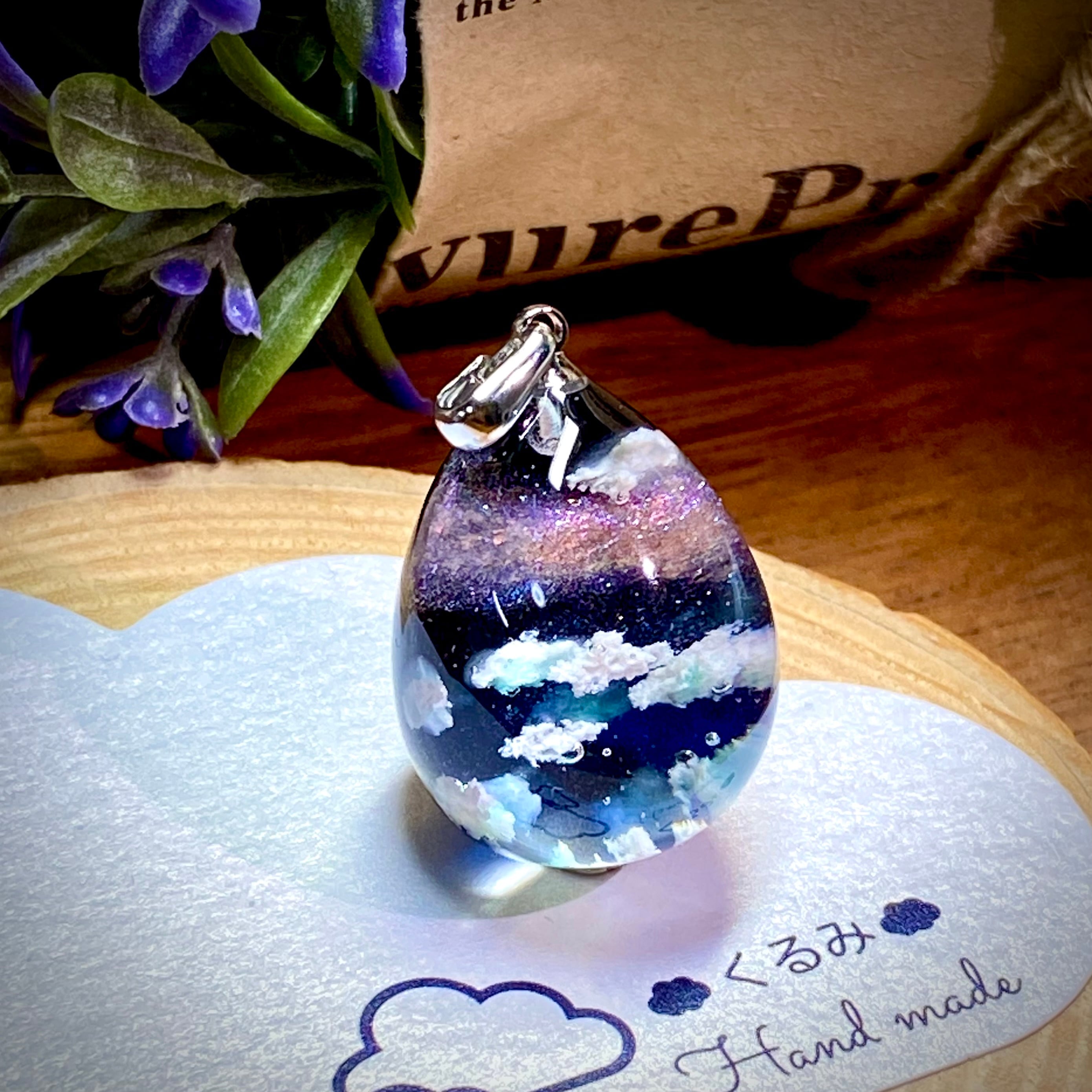たまご型で夜空と天の川をイメージしたペンダントを作りました。