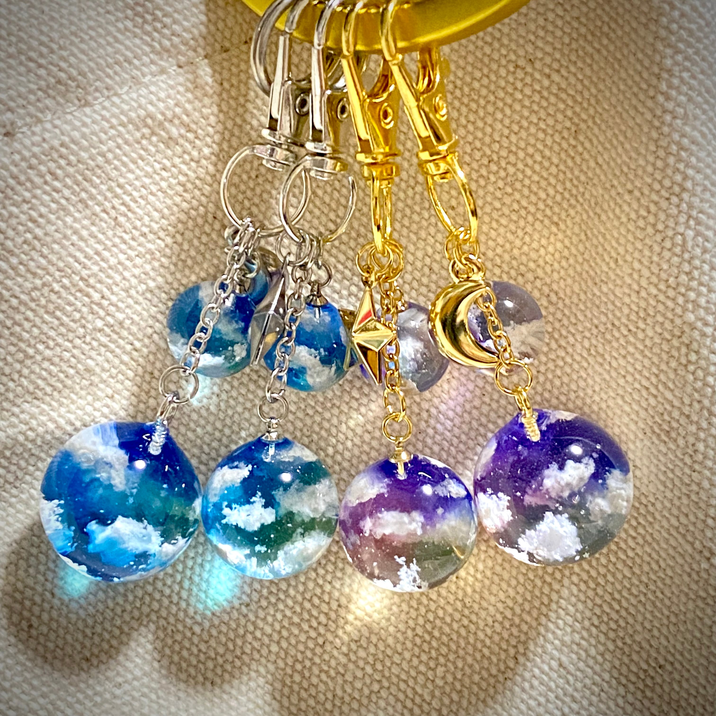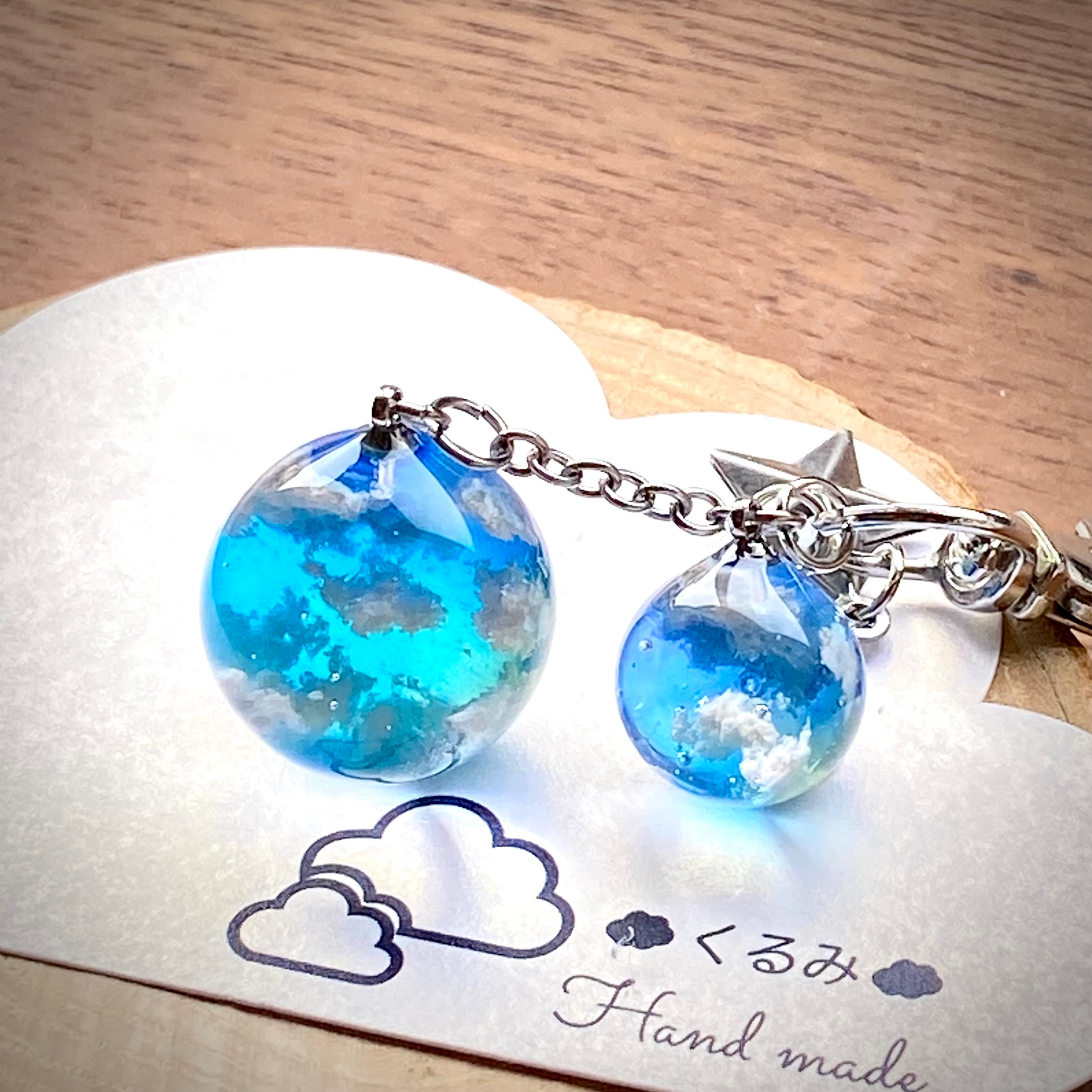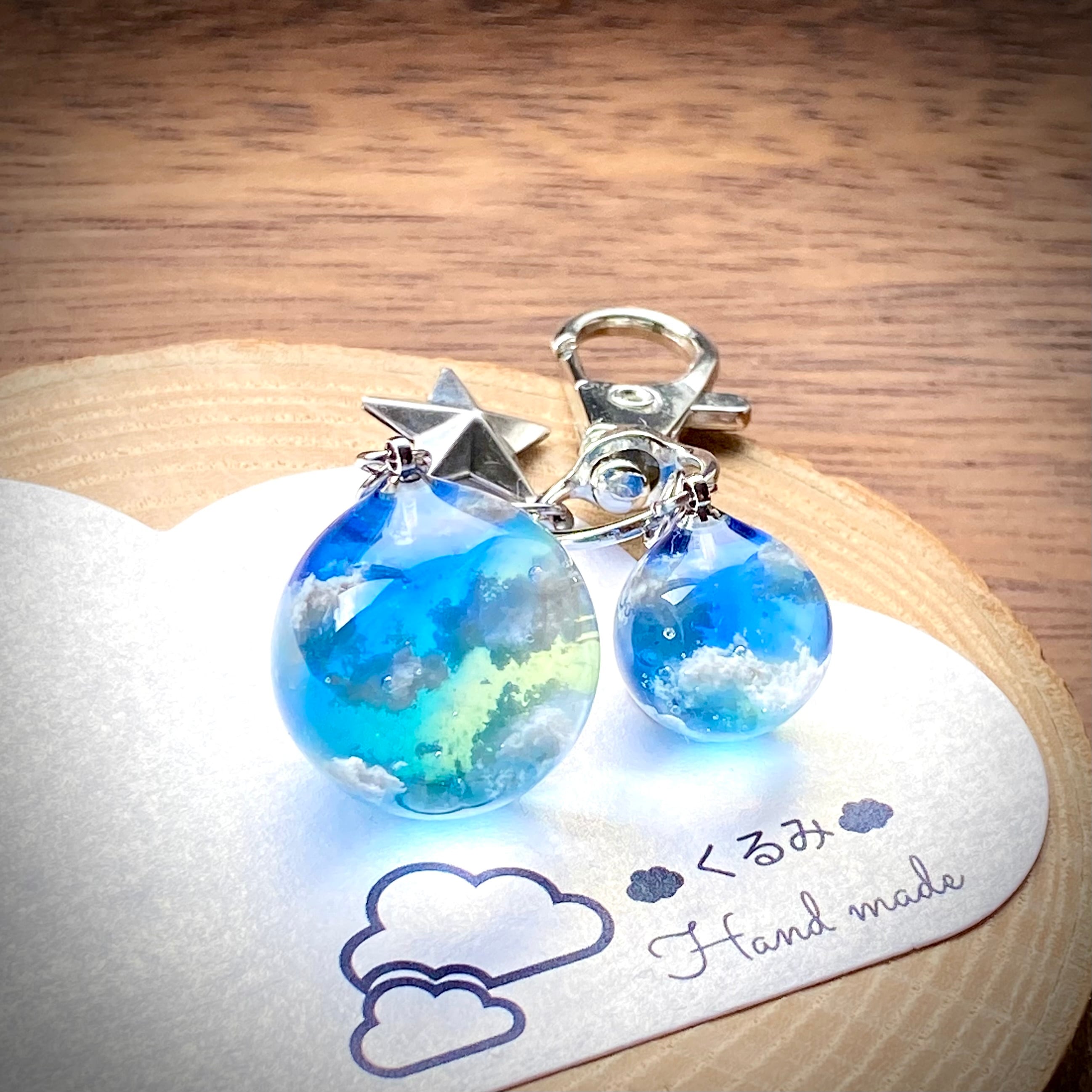 大小のまん丸な青空のバックチャームを作りました。