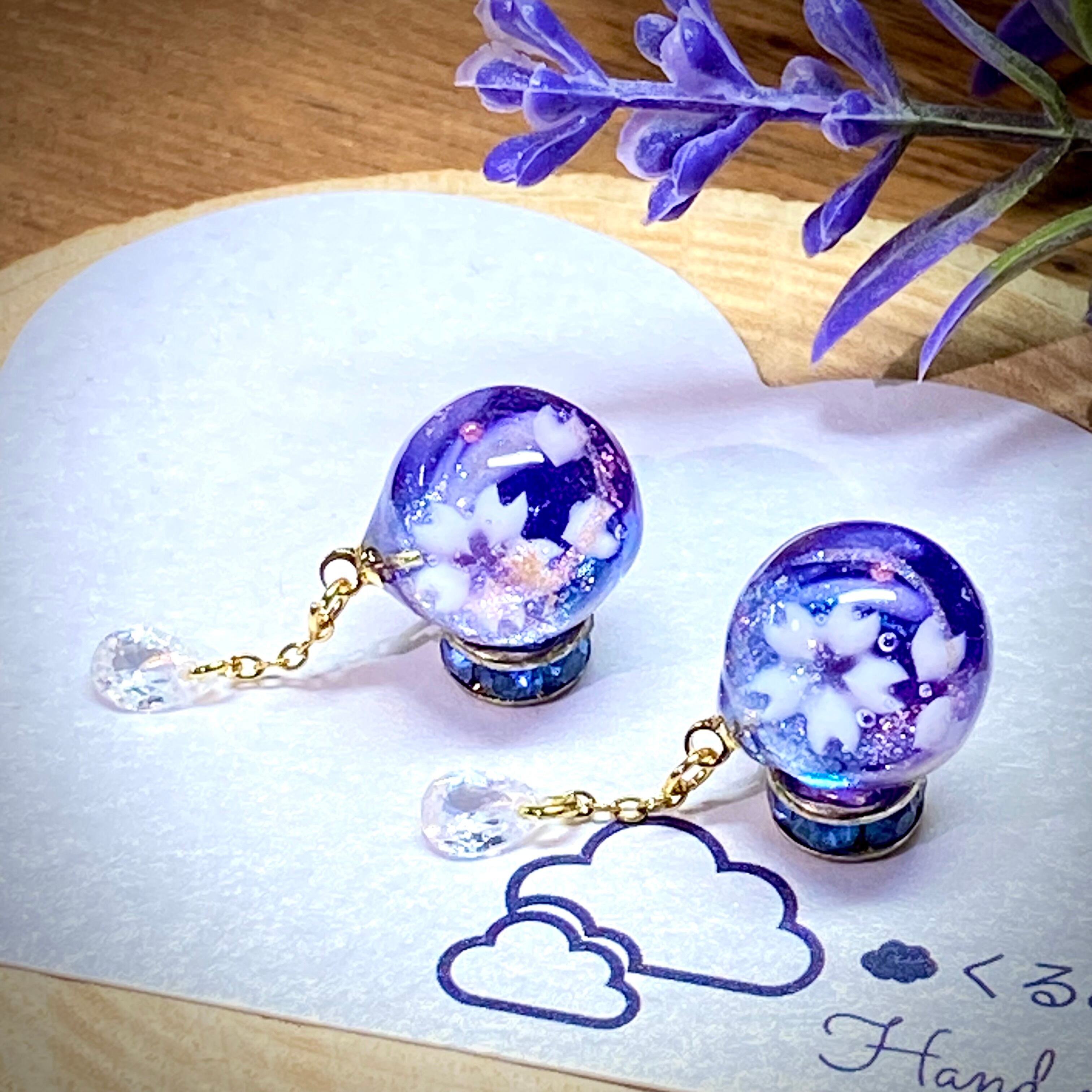 桜の花びらを閉じ込めたようなキャッチ式ピアスにドロップ型のキュービックジルコニアでお洒落可愛い揺れるピアスを作りました。