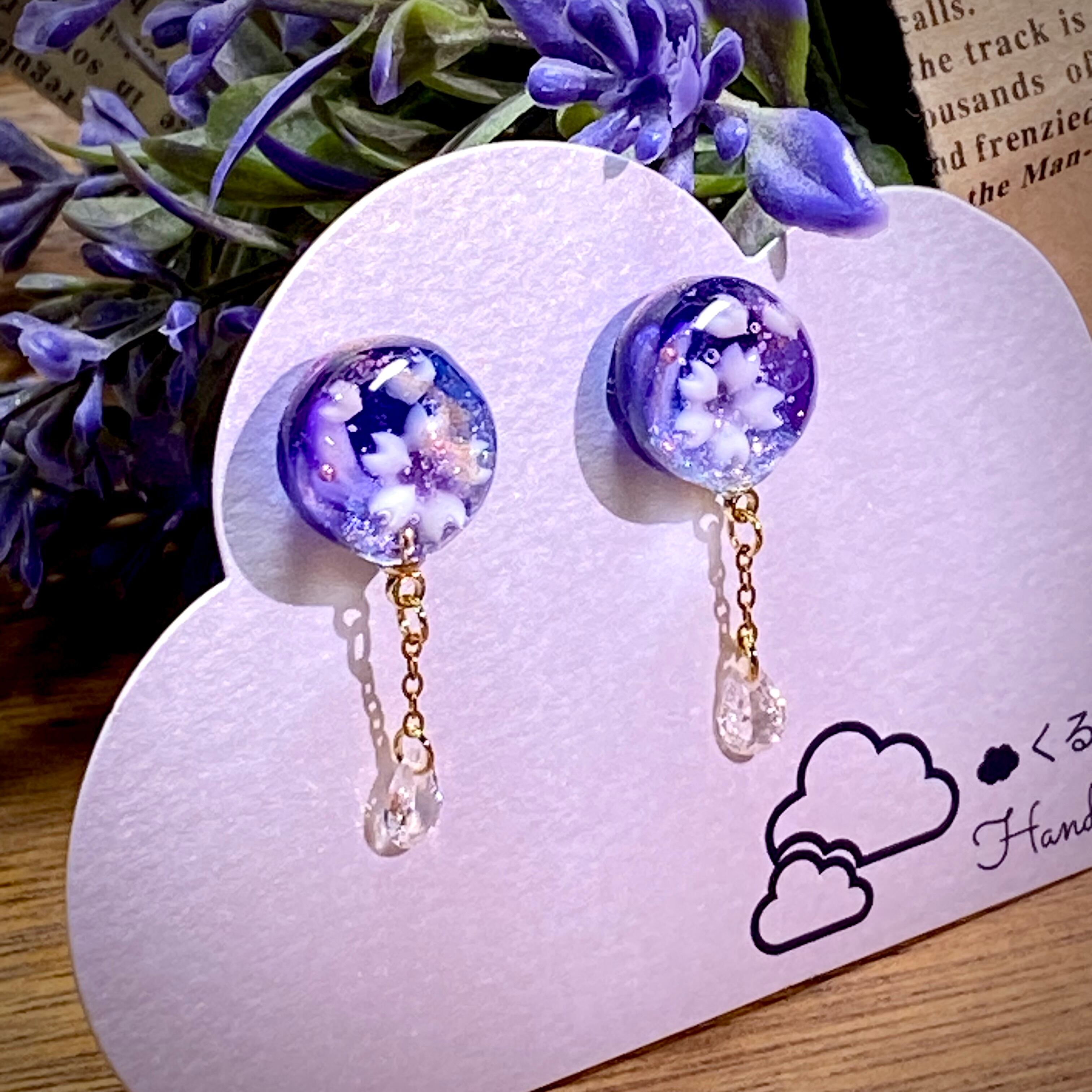 レジンキャッチ式ピアス 桜とドロップ型キュービックジルコニア/パープル サージカルステンレス