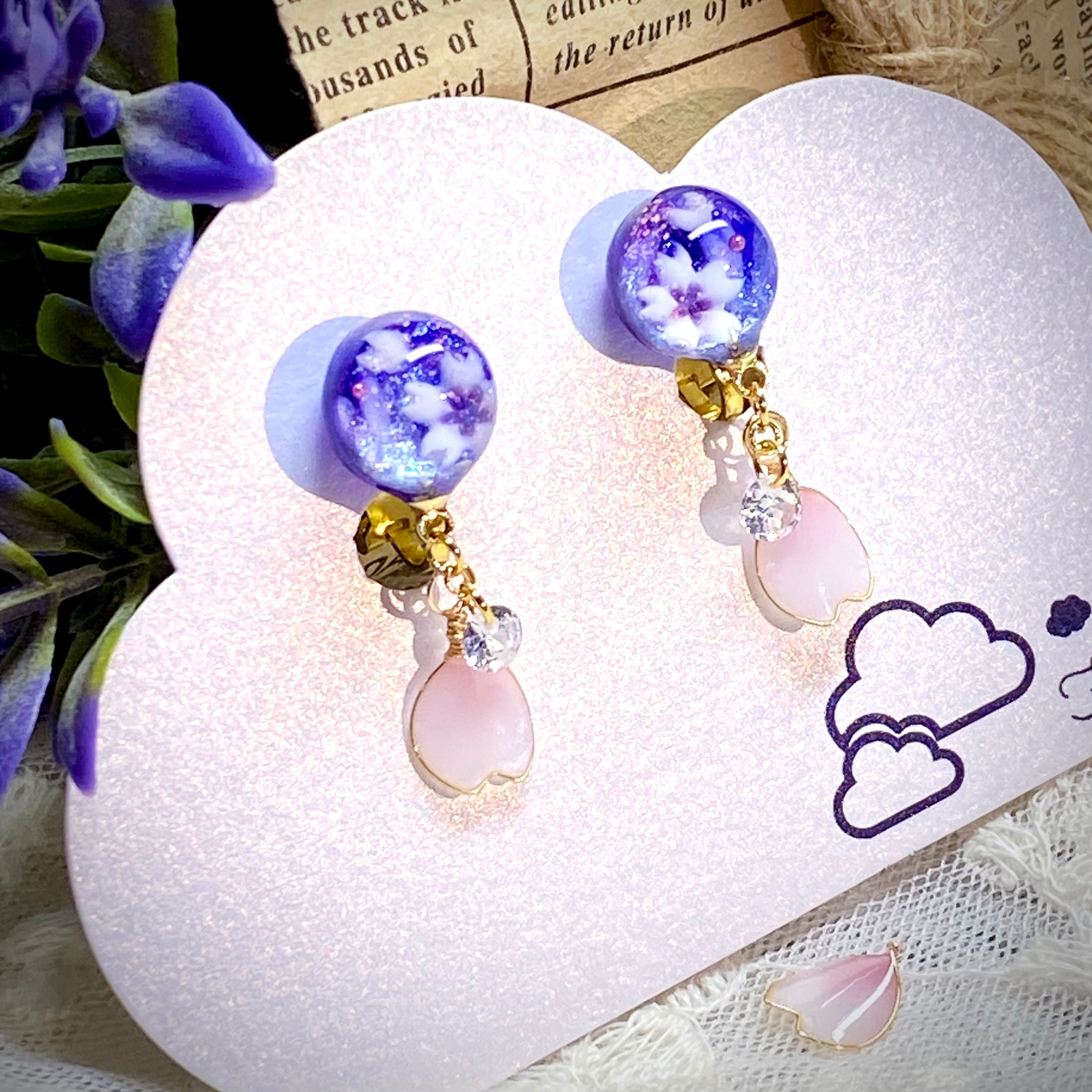 桜の花びらを閉じ込めたようなクリップ式イヤリングにアーティスティックワイヤーで製作した花びらとキュービックジルコニアでお洒落可愛い揺れるイヤリングを作りました。