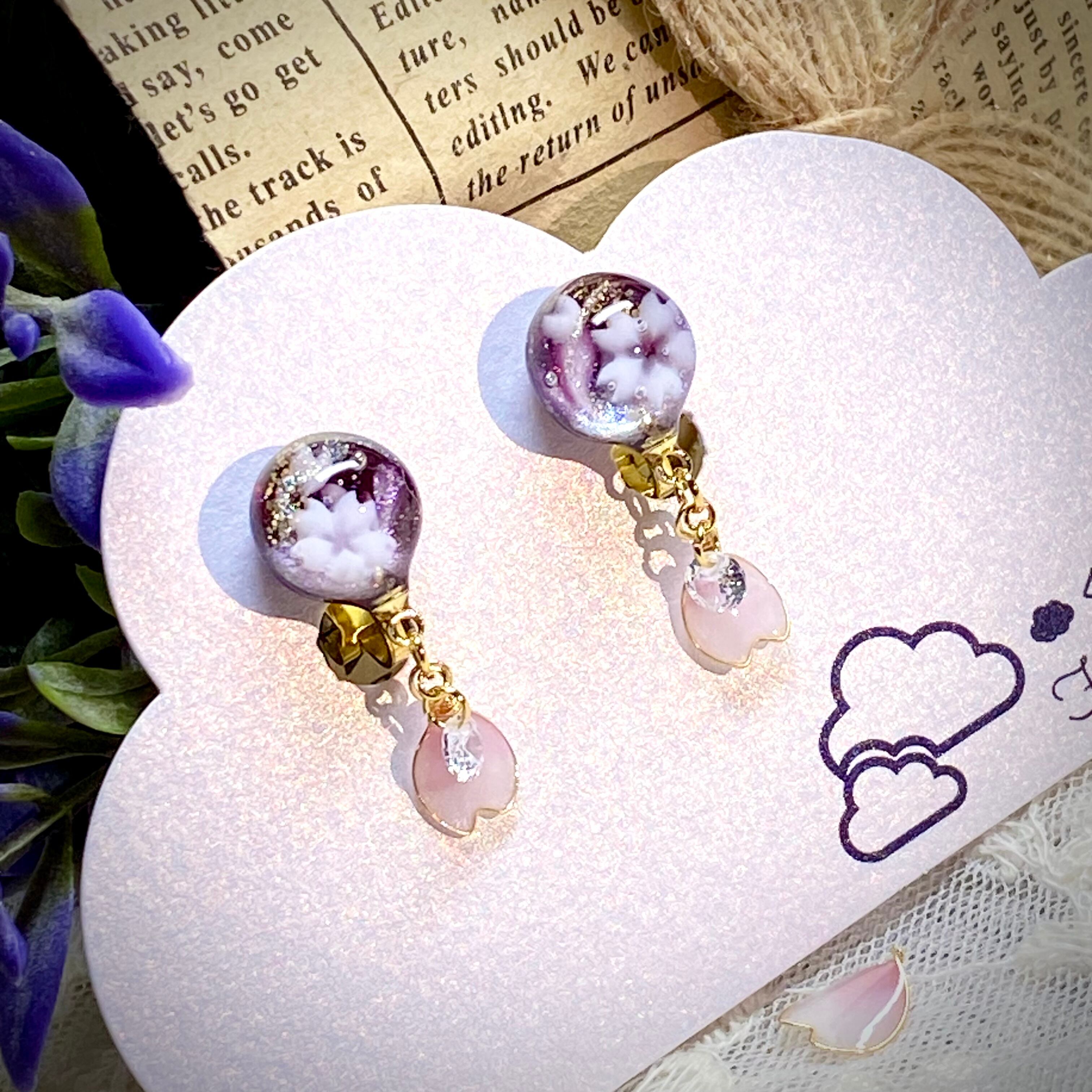 桜の花びらを閉じ込めたようなクリップ式イヤリングにアーティスティックワイヤーで製作した花びらとキュービックジルコニアでお洒落可愛い揺れるイヤリングを作りました。