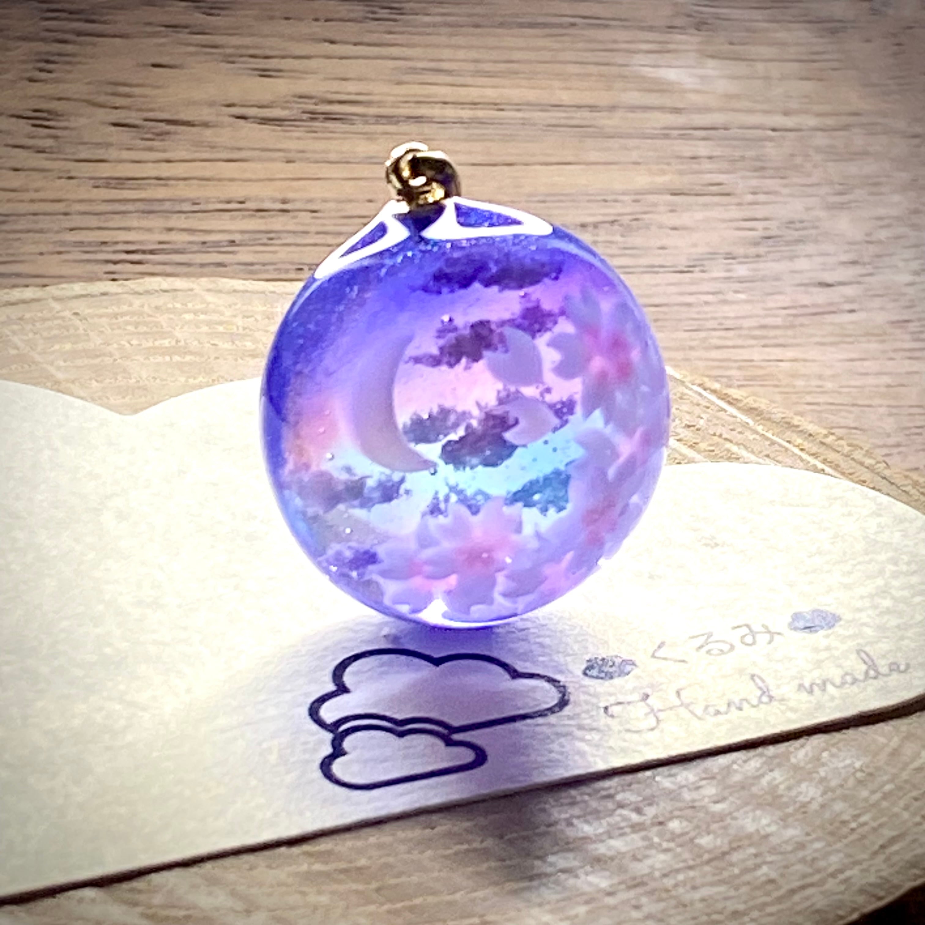 半球で三日月と夜桜のペンダントを作りました。