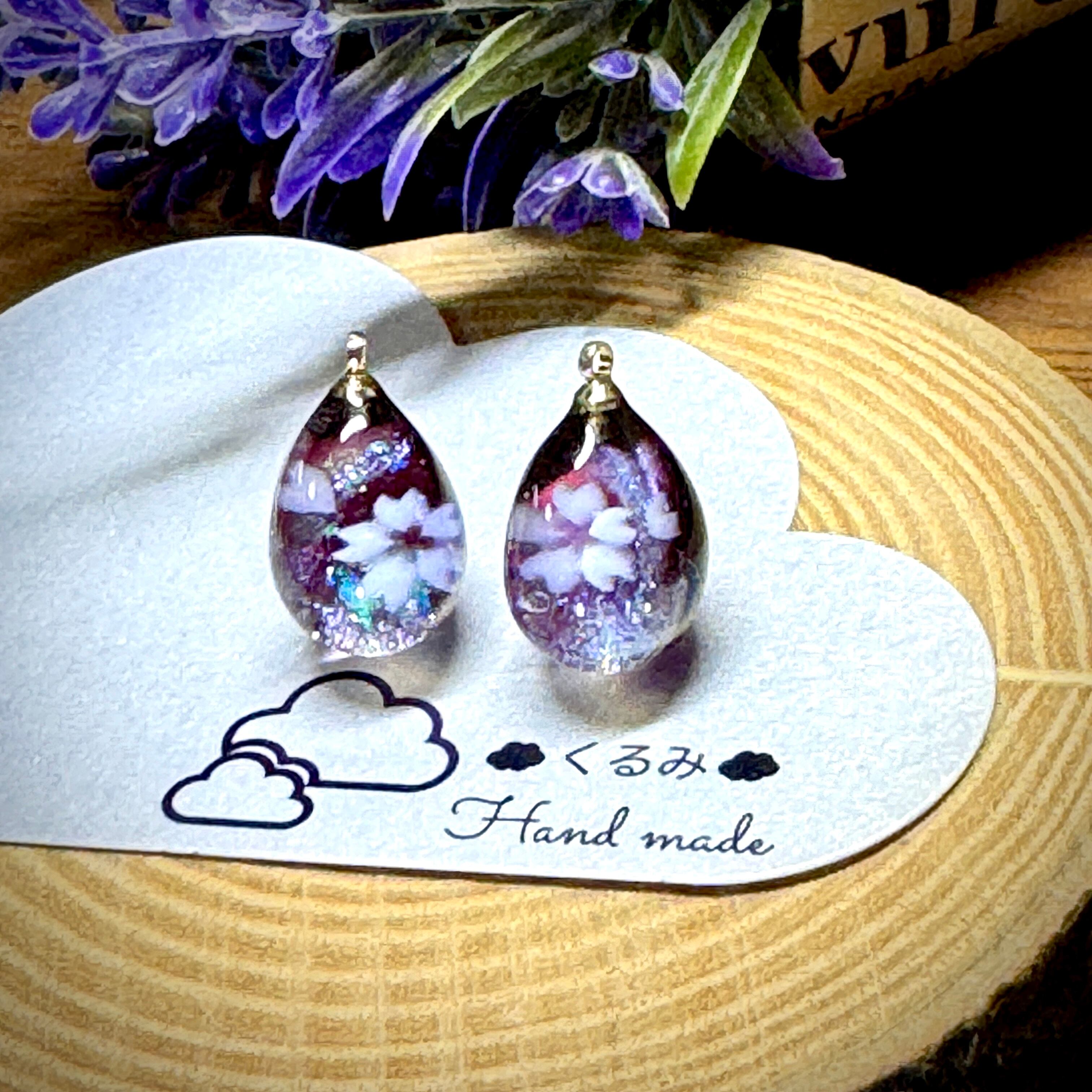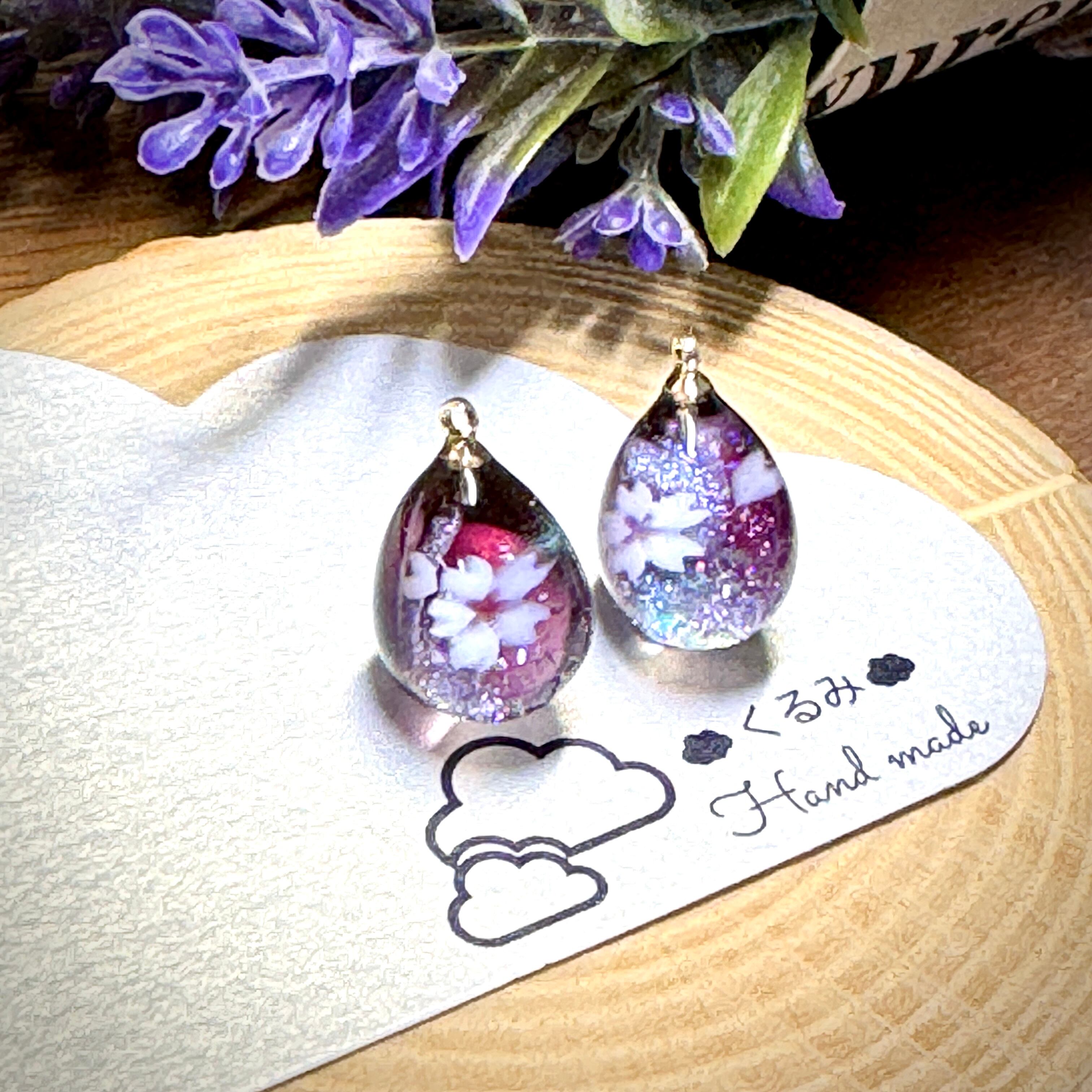 桜の花びらを閉じ込めたようなたまご型ピアスを作りました。