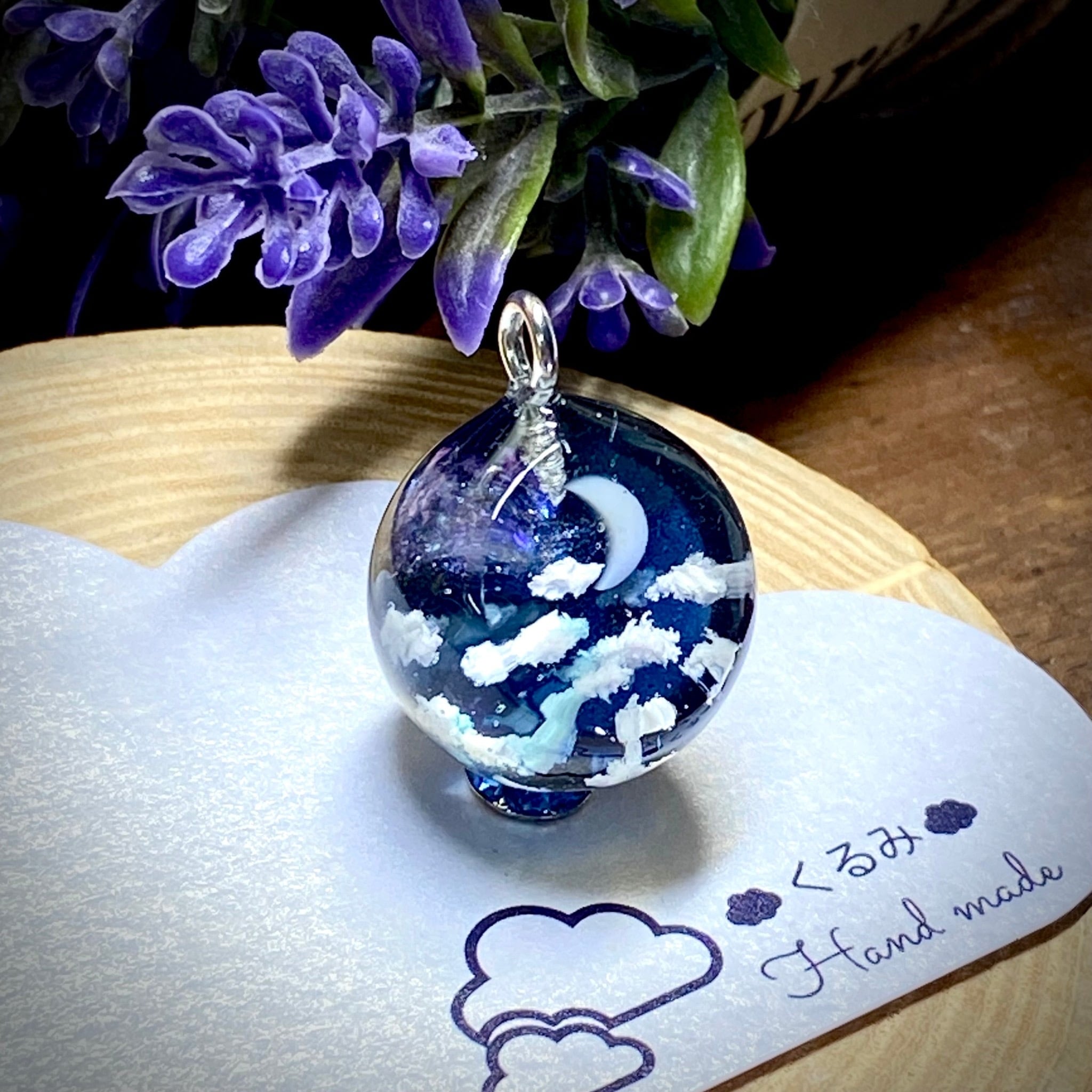 2割カット球体で夜空 三日月と天の川のペンダントを作りました。