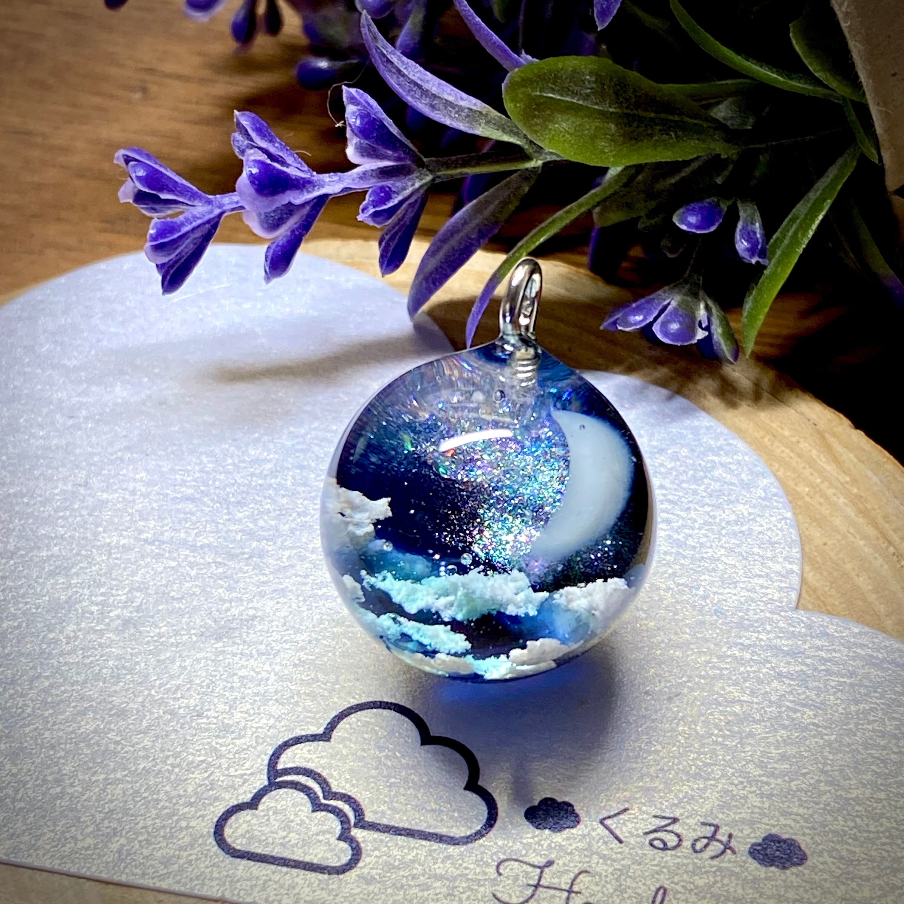 夜空 三日月と天の川のまん丸なペンダントを作りました。
