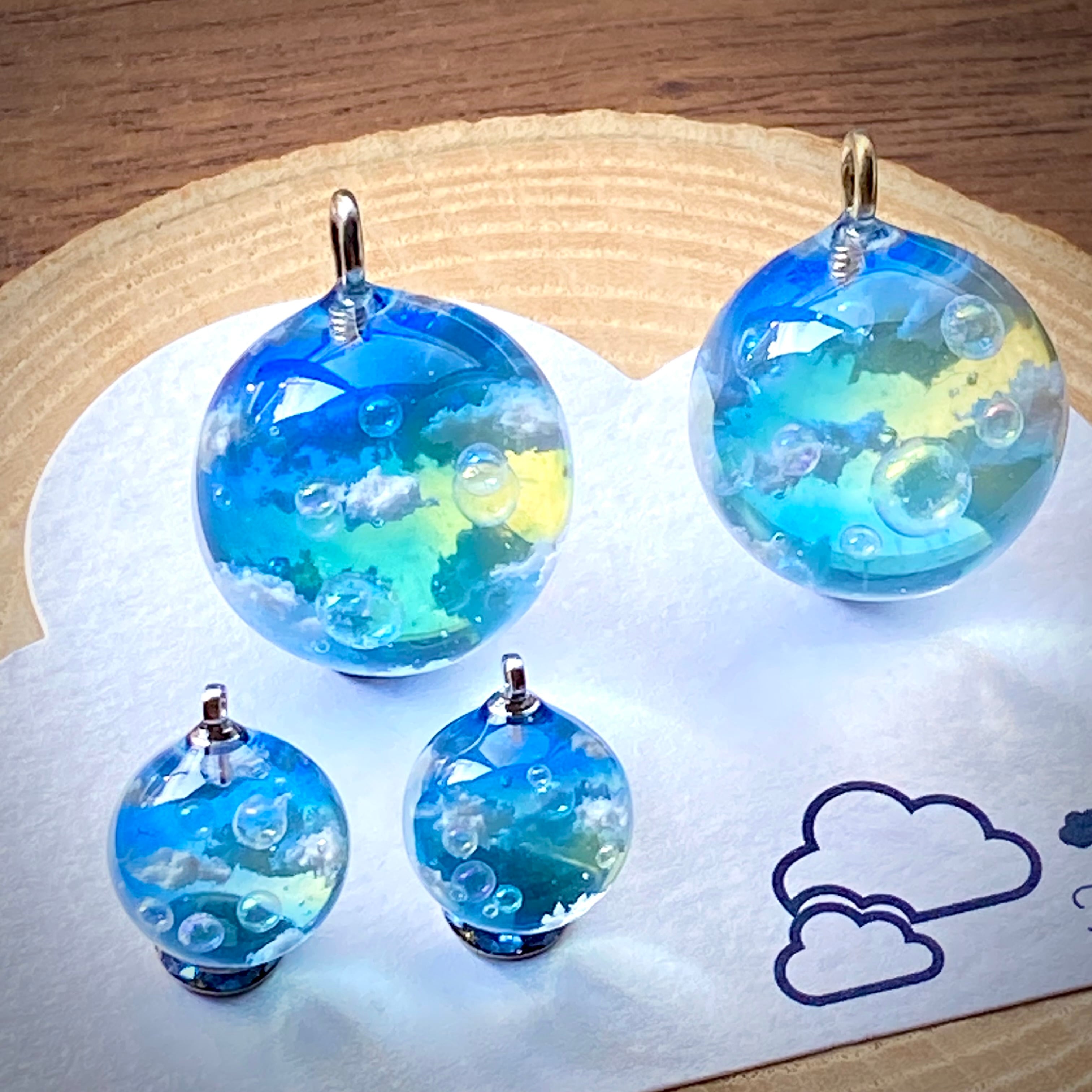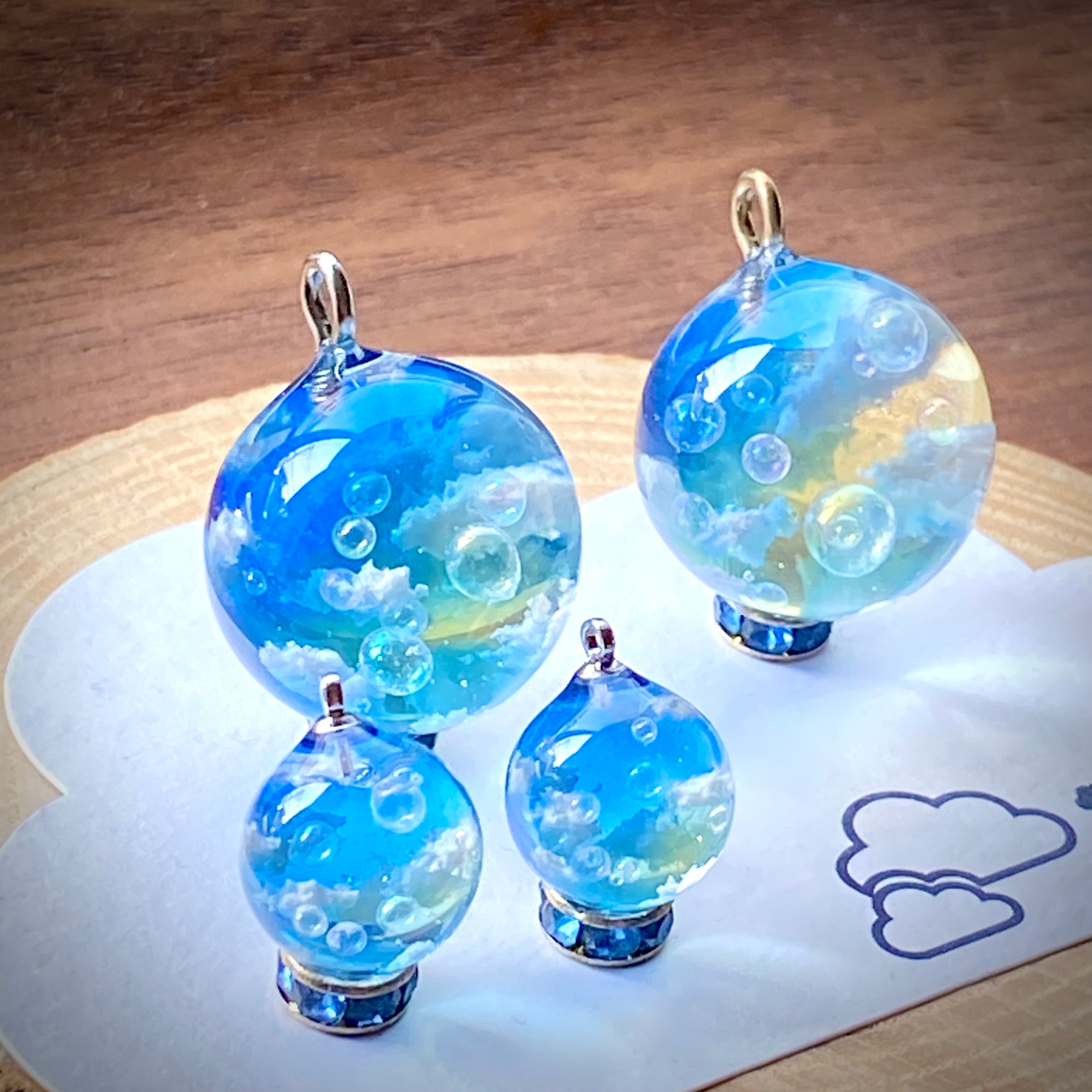 青空とシャボン玉をイメージしてまん丸なピアスを作りました。